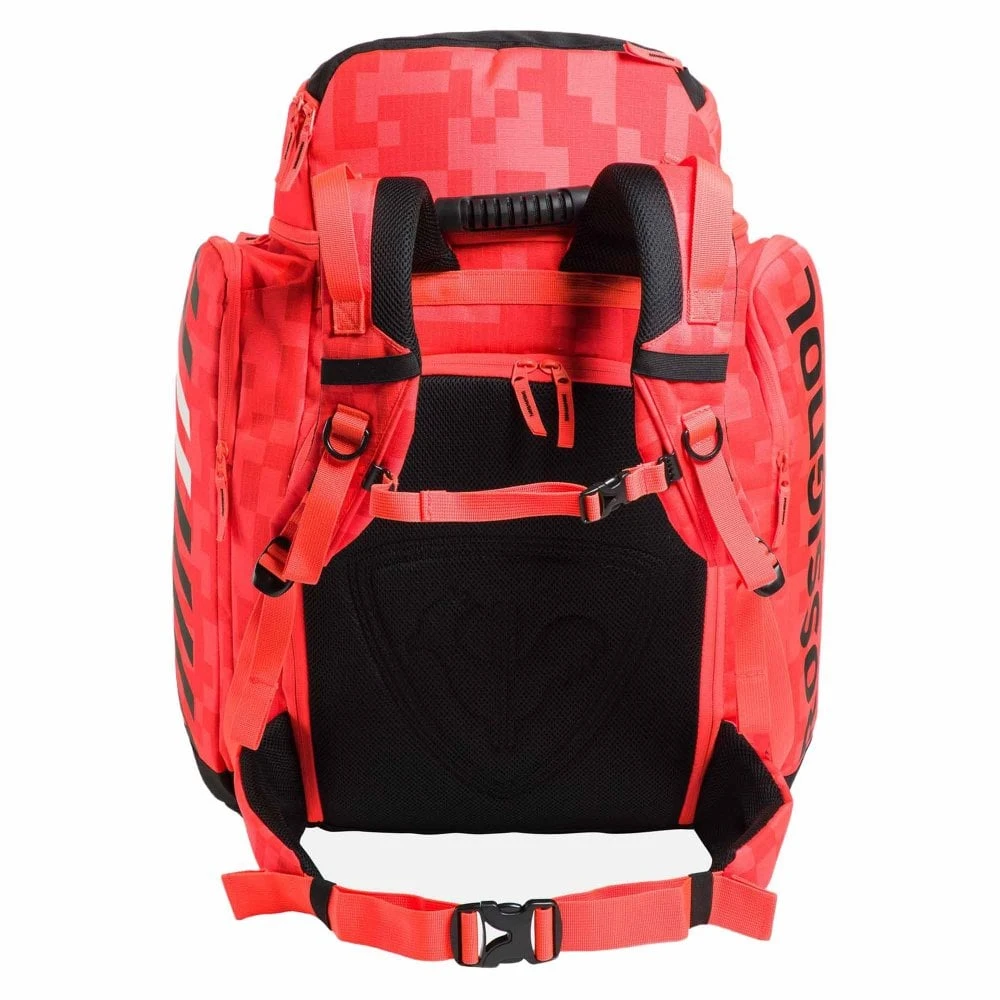 The Rossignol Hero Athletes Bag is an extra-large, World Cup circuit-ready backpack built for hauling ski race gear, boots, goggles and a helmet. The pack is designed to keep your gear dry, organised and easy to locate. Lined side compartments separate boots from other gear, while protective internal zones keep a helmet and goggles easy to grab. The massive main compartment has plenty of space for layers and race-day gear. Smaller zip pockets add organisation. Weatherproof ripstop polyester and a waterproof tarpaulin bottom keep contents dry in all conditions.